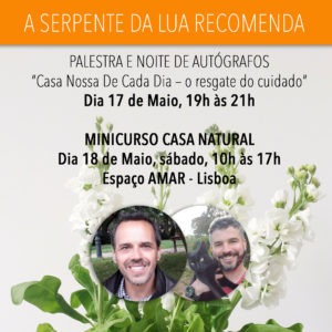 A Serpente da Lua Recomenda! Palestra e Noite de Autógrafos “Casa Nossa De Cada Dia – o resgate do cuidado” Carlos Solano e Luiz Giacomelli – Brasil Dia 17 de Maio, 19h às 21h no Espaço AMAR, Lisboa “Tudo que é vivo precisa de cuidado para continuar a existir”, seja uma pessoa, uma relação, uma casa, uma cidade, um planeta. Carlos Solano é arquiteto e escritor. Luiz Giacomelli trabalha com Leitura de Aura de pessoas, ambientes e grupos, exercendo…